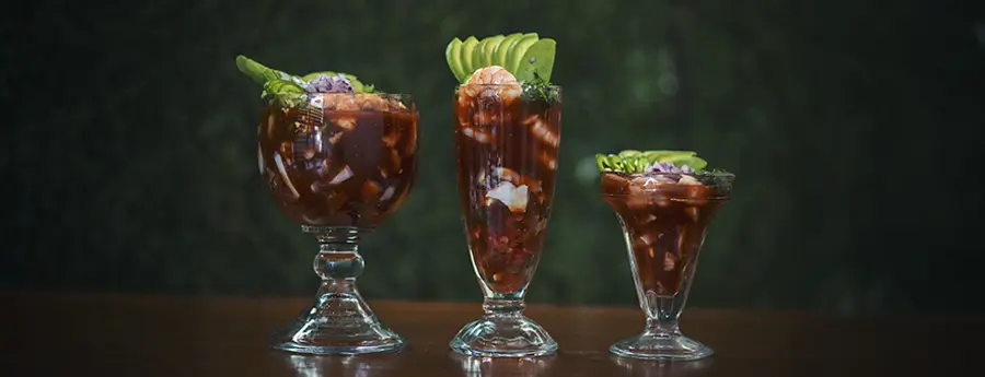 Copa marisquera rellena de camarón crudo cortado en trozitos, curtido en limón, ahogado en Clamato especial salseado acompañado de cebolla Morada y salseado con salsa de la casa