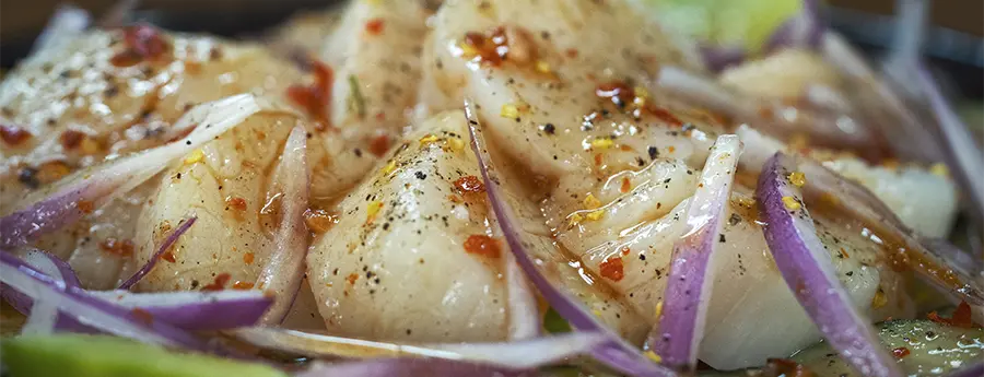Callo de hacha fresco sal pimentado y con chiltepín, acompañado de pepino y cebolla morada (A existencia)