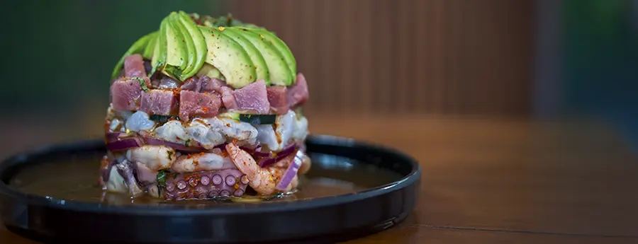 Camarón crudo,camarón cocido y atún medallón fresco preparado al momento con la salsa de la casa a base de chiltepin mezclado con pepino y cebolla morada fileteada acompañado de aguacate