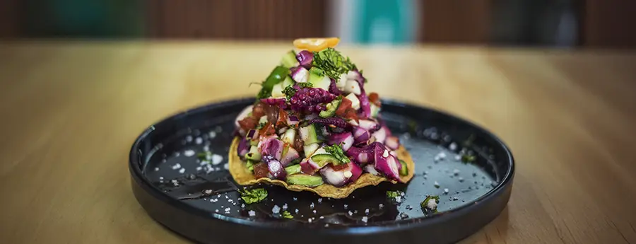 Pulpo fresco en trozos salpimentado con pico de gallo y pepino, acompañado de aguacate