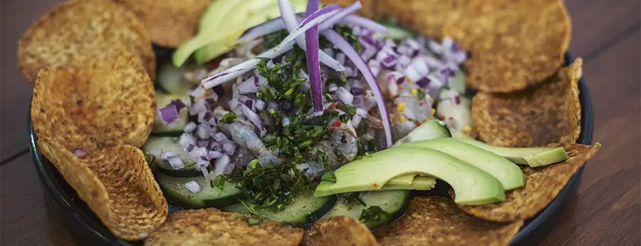 Cama de crujientes Tostitos coronada con camarón crudo fresco cortados en trocitos preparados al momento , curtidos en limón y sal-pimentados con pico de gallo y pepino, acompañados de aguacate
